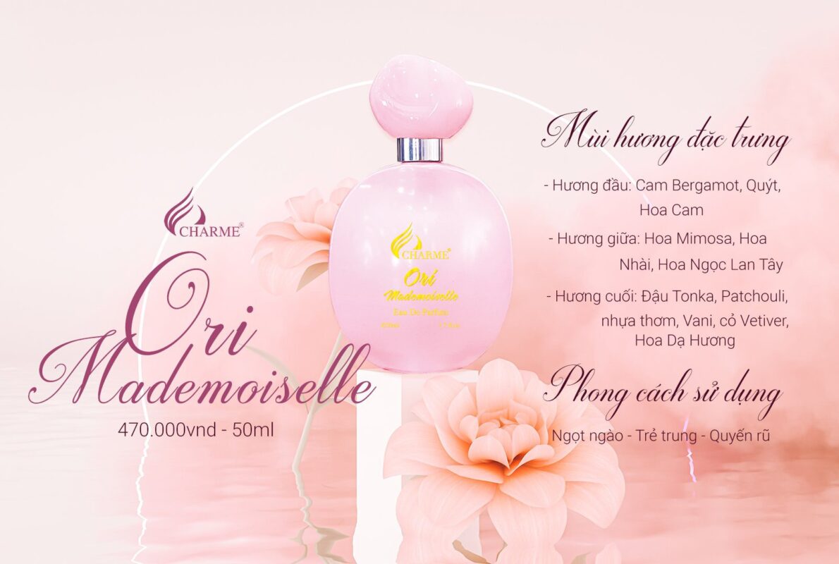 Lớp hương đầu của Charme Ori Mademoiselle à sự kết hợp của hương trái cam Sicily, cam bergamot Calabria và hương trái bưởi Sicily. Lớp hương giữa là hương hoa cỏ được tạo ra bởi thành phần tinh chất hương hoa hồng tinh khiết kết hợp với tinh chất hương hoa nhài, kèm theo với hương trái vải mọng nước, ngon ngọt. Trong khi đó, lớp hương nền là sự kết hợp của thành phần hoắc hương Indonesia, cỏ lau Haity, vani Bourdon và xạ hương trắng. Dòng nước hoa này dành riêng cho những người phụ nữ hiện đại, gan dạ, yêu thích sự thanh lịch và sang trọng.
